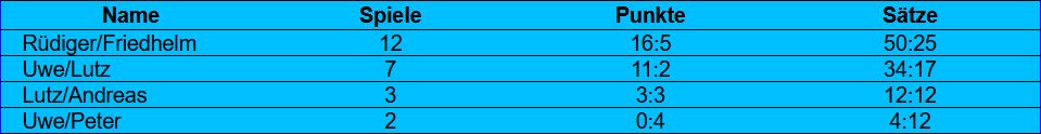 Zur Rückrunde hatten wir unsere Aufstellung verändert. Ich spielte hinter Rüdiger auf Platz 2. Uwe und Lutz rückten dadurch einen Platz nach hinten. Rüdiger blieb weiter an 1. Bei den Ergänzungsspieler hatte sich nichts geändert.